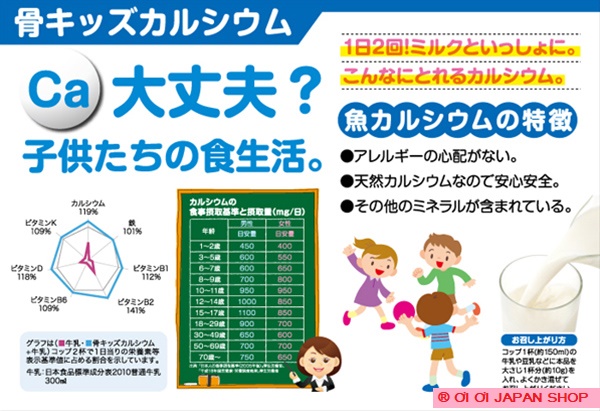 Canxi (từ cá) 500mg, Sắt 7.5mg, Vitamin D 5.0 µg, Vitamin K 70 µg, Vitamin B1 1.0 mg, Vitamin B2 1.1 mg, Vitamin B6 1.0 mg..