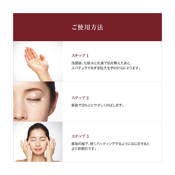 Sử dụng 2 lần mỗi ngày. Thoa một lượng vừa đủ kem lên vùng quầng mắt và mí mắt. Sau đó dùng ngón tay thoa đều theo hình xoắn ốc cho đến khi kem được hấp thụ hoàn toàn vào da.
